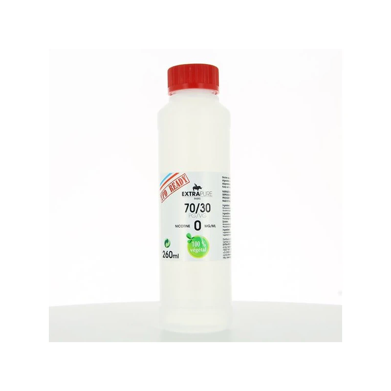 Base neutre 100% d’origine végétale, fabriquée en France et composée de mono Propylène de Glycol végétal (issu du colza et du maïs) et de Glycérine Végétal. 70/30 PG/VG